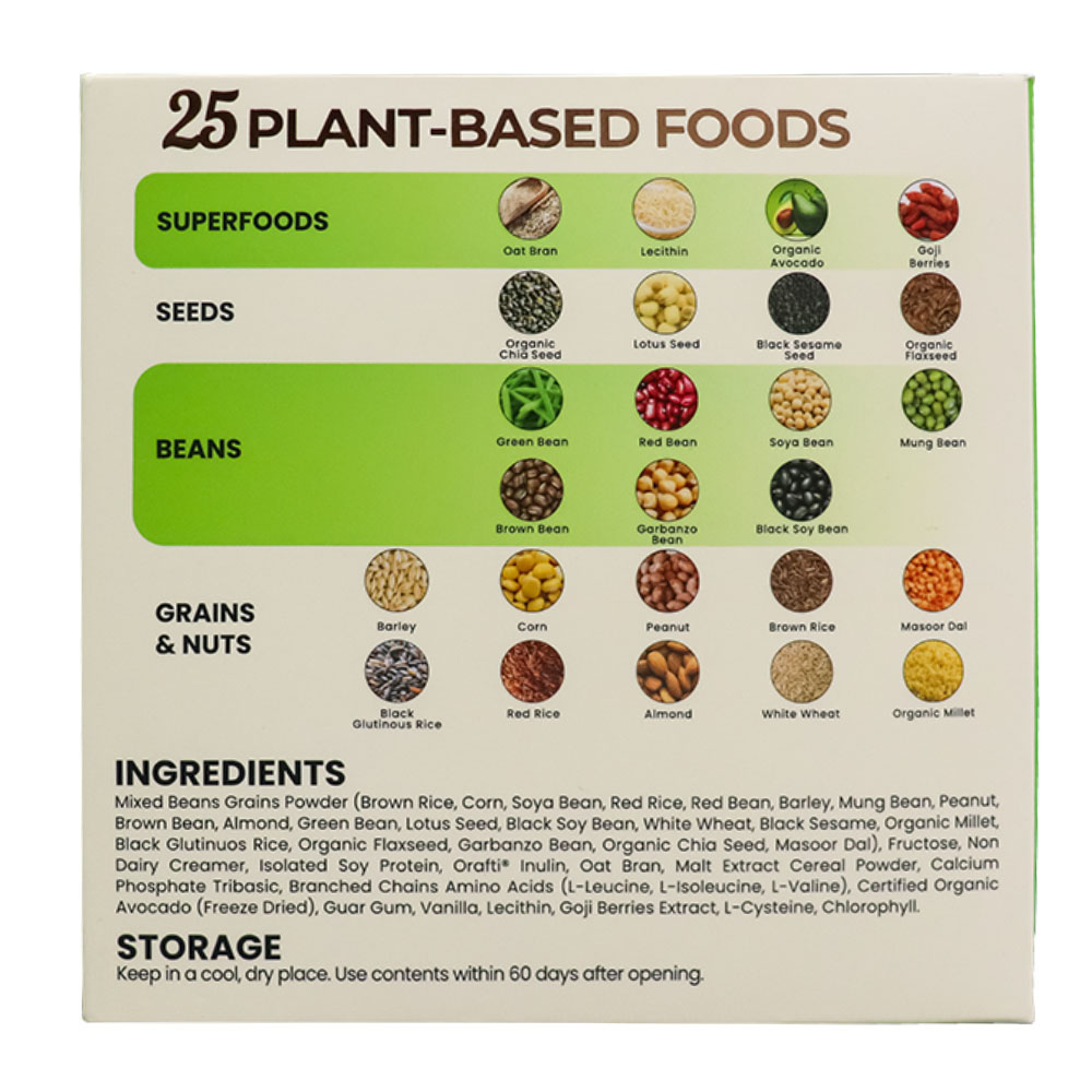 – Sản phẩm thuần chay từ 25 loại thành phần dinh dưỡng theo tỷ lệ khoa học, bổ sung được các thành phần như bơ hữu cơ từ Newzealand, cám yến mạch, đạm đậu nhành phân lập, kỳ tử, inulin, lecithin, chuỗi axit amin phân nhánh…